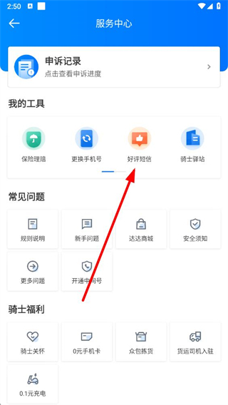 3、在服务中心的我的工具板块中,点击好评短信选项,进入求好评短信设置页面。