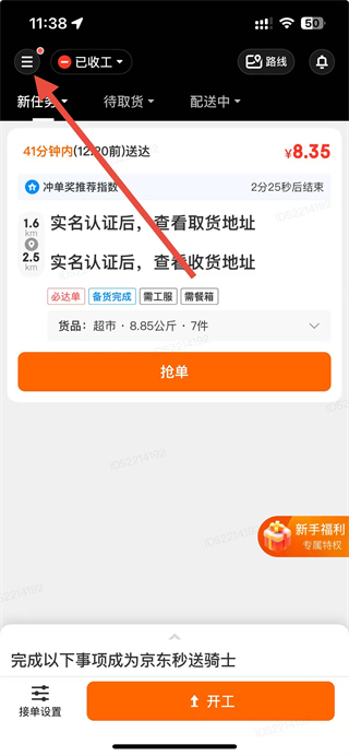 1、进入京东秒送骑士界面后,点击左上角菜单按钮,展开功能选项。