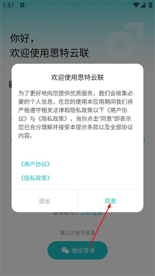 1、在欢迎使用思特云联的协议弹窗中,点击同意,进入思特云联的登录页面。