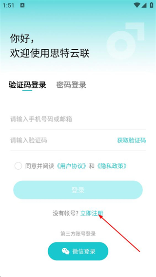 2、在思特云联登录页面,点击立即注册选项,进入新注册账户的操作页面。