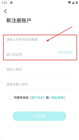 3、在新注册账户页面,填写请输入手机号码或邮箱对应的信息,并填写输入验证码的内容。