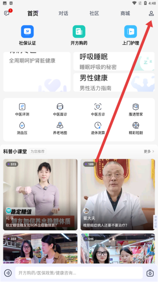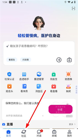 1、打开老来健康app,点击首页底部导航栏的社区选项,进入社区页面。