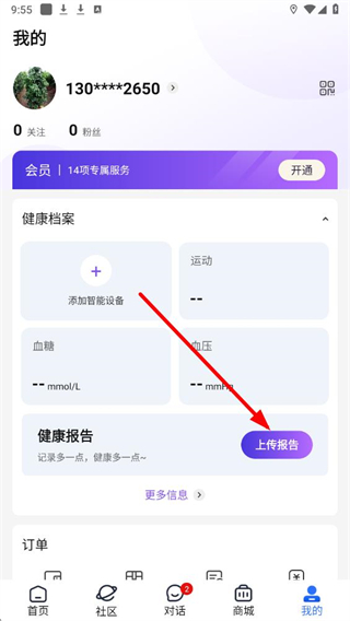 2、在我的个人界面,找到健康报告板块,点击右侧的上传报告按钮,进入报告上传页面。