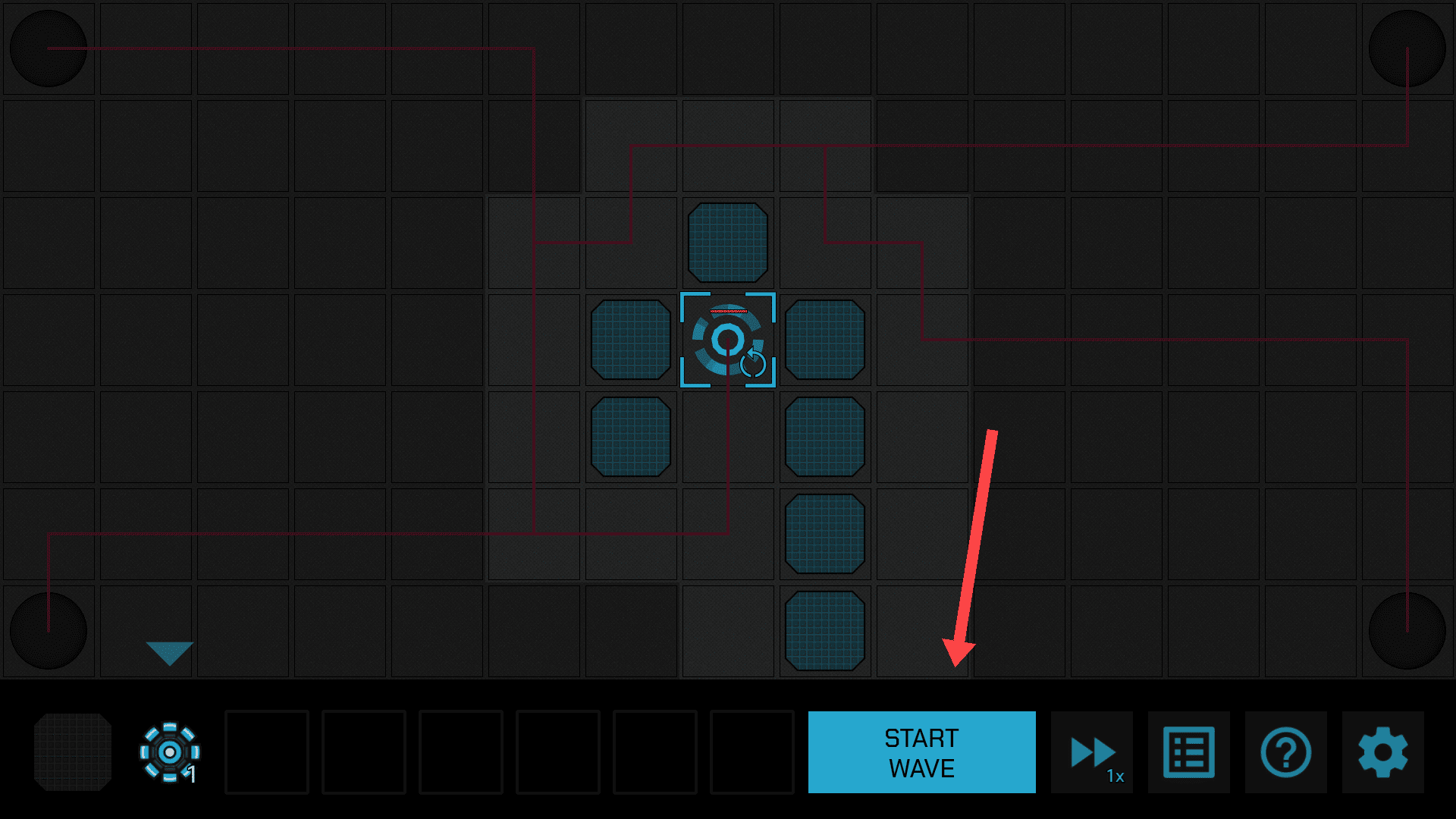 3、布置好机关后,我们可以点击箭头所指的按钮开始防御。