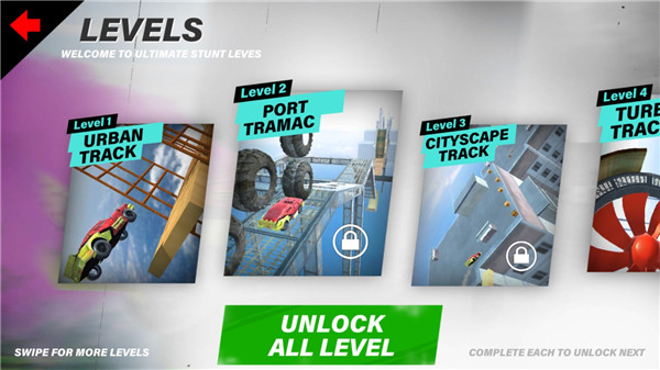 2、在关卡选择界面,点击已解锁的关卡,开启特技赛车挑战,后续可通过完成关卡解锁新关卡。
