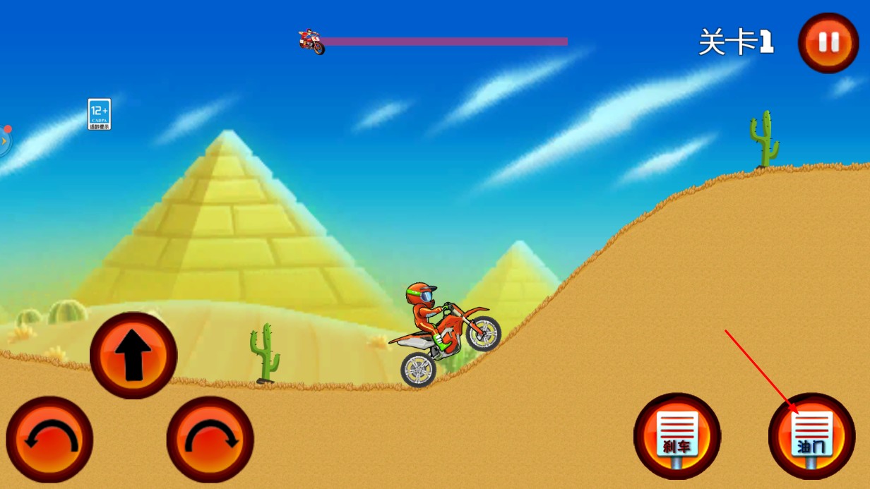 3、点击右侧“油门”按键,能让摩托车加速,在沙漠等场景行驶。