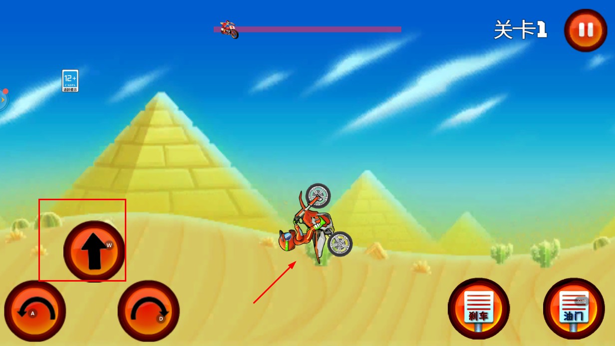 4、点击左侧向上箭头按键,可控制摩托车的行驶的跳跃姿态,应对地形变化。